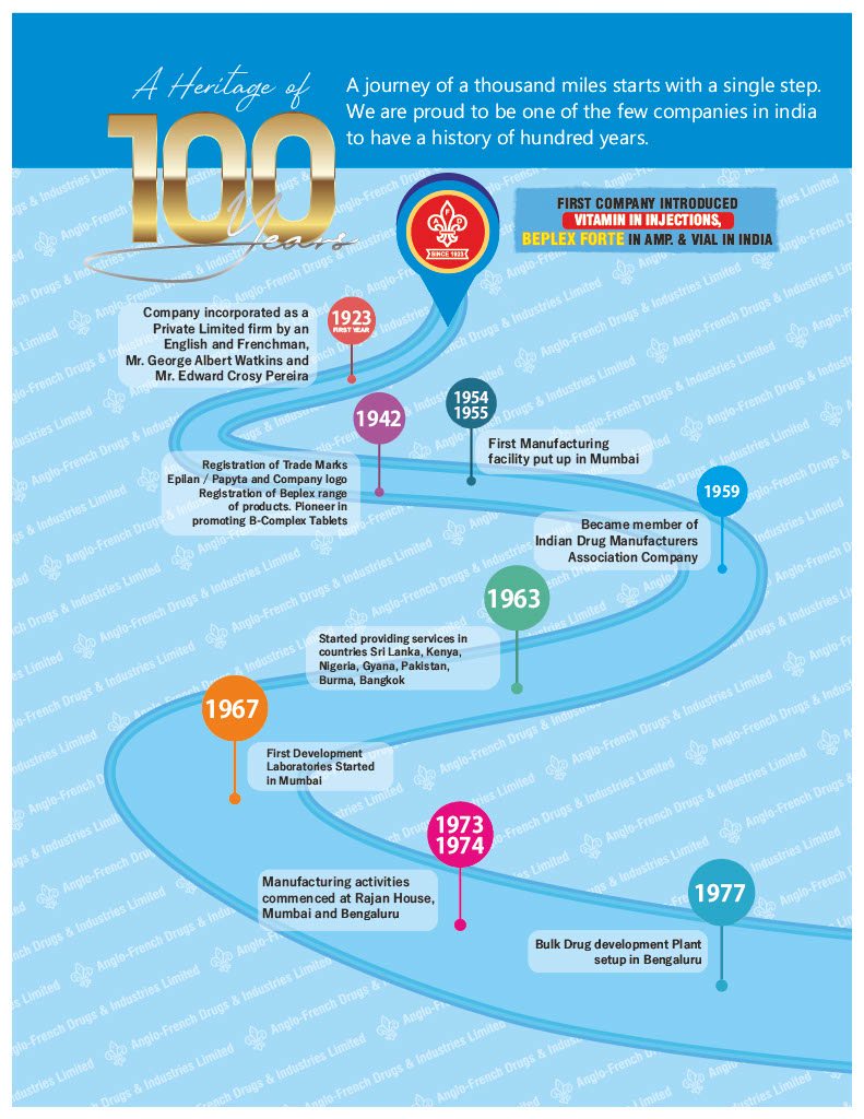 Anglo-French Drugs and Industries Limited (AFDIL) is a pharmaceutical company based in Bengaluru. AFDIL stands among one of the most prominent pharmaceutical companies not just in India but also worldwide. We have privilege of being the first company to manufacture single vitamin injections and a combination of B-complex Vitamins in lndia. Anglo-French’s journey began in 1923 when it was started with a vision to make India self-sufficient in manufacturing of nutrition healthcare products. Today, we have emerged as a dynamic, rapidly expanding pharmaceutical company with capabilities of the development of therapeutic formulations. We are thriving through the marketing, sales and distribution of these products.